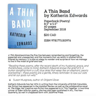 "Katherin Edwards' A Thin Band is a heartbreaker. The clarity in her lines, the startling leaps in her language, the moral complexity in the imagery itself are nothing short of gorgeous. Though deeply engaged with loss and grief, this is nevertheless a poetry about life: how to live in the world, and to go on living, as fully and richly as we can." Steven Price